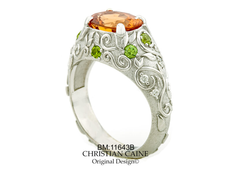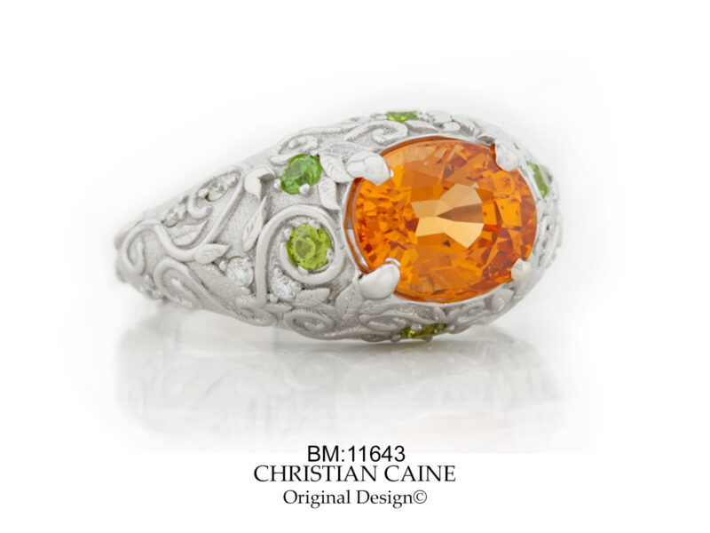 A CC Original Mandarin Spessartite Garnet ring featuring diamonds and green garnets accents. This unique ring features organic scroll work and leaves flowing through out this garden themed design. Wow!