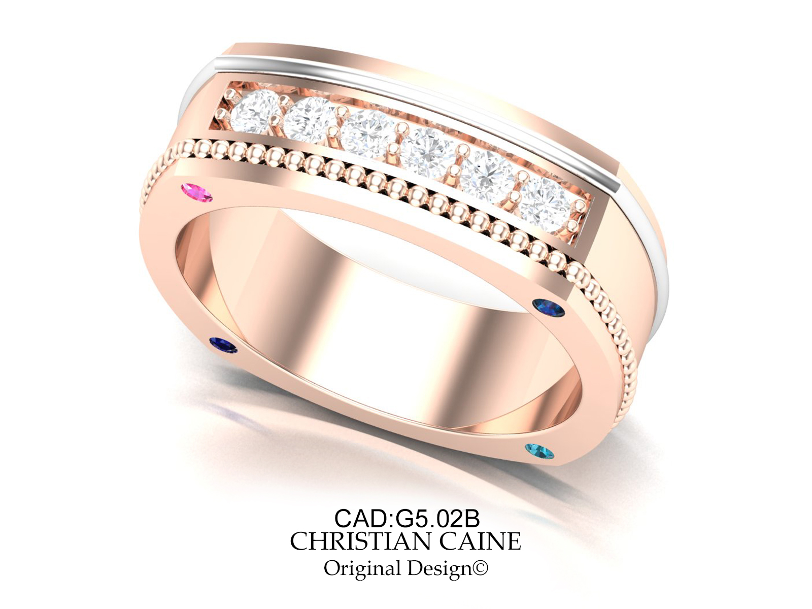CC Original wedding bands. One ladys rose gold and matching diamond white gold eternity band with milgrain details. The gents band features  channel set fine cut diamonds with milgrain and pipe detailing.  Four accent colored diamonds in the corners, designed in 14karat rose gold.