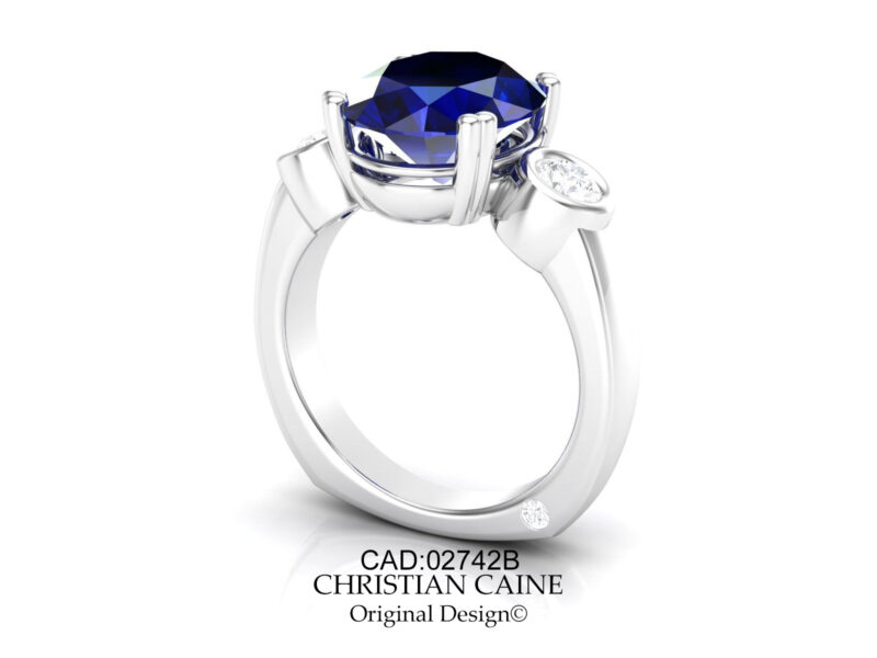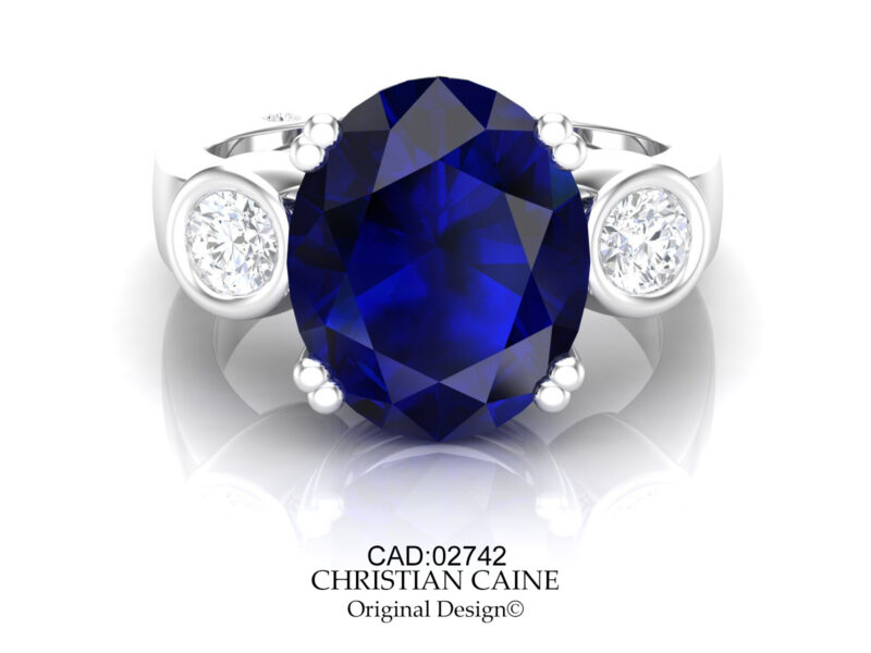 Clean, classic and contemporary.   A center very fine oval blue Sapphire,  in a 4-double prong style setting.  Very fine cut round side diamonds set in full bezels.  Featured with a European style shank with an ideal cut round accent diamond.  Stunning design!
