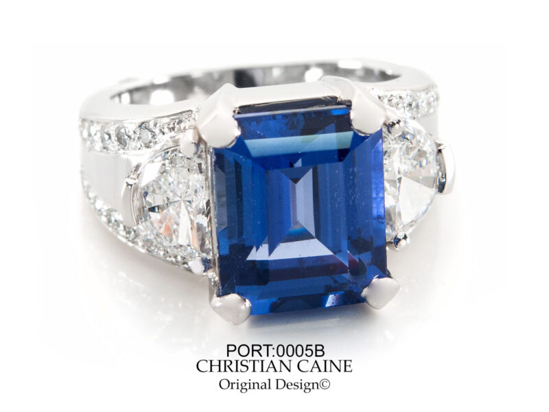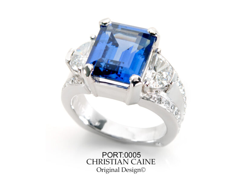 A CC Original Design! Stunning natural Sapphire with half moon side diamonds. Classic with a modern flare!
